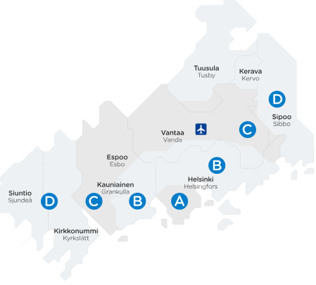 Helsinki Region Transport (HSL), the public transport provider for Helsinki, has divided the metropolitan area into 4 zones, identified by the letters A, B, C, and D, spreading out from the center of Helsinki.